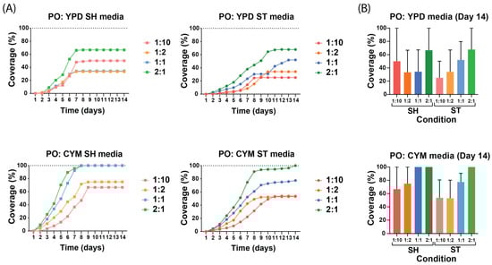 Growth curves of P. ostreatus under different preculture conditions and dilutions. All values are presented as mean from n ≥ 2 independent samples and 1:10 to 2:1 indicate the dilution of mycelium in the liquid media. (A) Growth curves of liquid spawn of each medium and each condition. The growth curves highlight how these variables affect the growth kinetics across different media and conditions. (B) Coverage percentage of all static and shaking conditions on the 14th day of growth of P. ostreatus in YPD and CYM media.