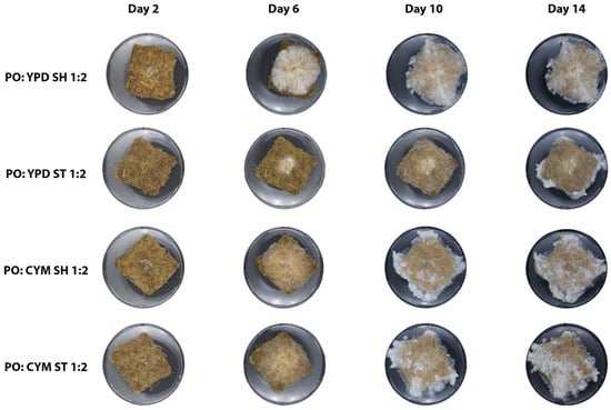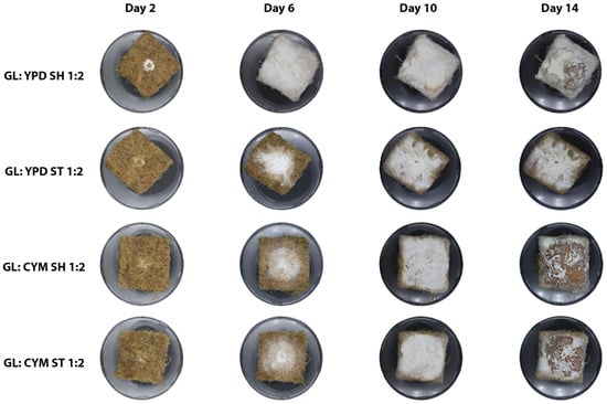 G. lucidum primarily grew within the mat area and did not produce aerial mycelium (Figure 6). It exhibited a denser growth pattern, with the mat’s structure covered by hyphae. Additionally, G. lucidum underwent color changes. For both YPD ST and SH conditions, G. lucidum started to change color between days 6 and 13, whereas in CYM ST and CYM SH, the color changes began between days 8 and 11.