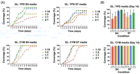 Growth curves of G. lucidum under different preculture conditions and dilutions. All values are presented as mean from n ≥ 2 independent samples and 1:10 to 2:1 indicate the dilution of mycelium in the liquid media. (A) Growth curves of liquid spawn of each medium and each condition. The growth curves highlight how these variables affect the growth kinetics across different media and conditions. (B) Coverage percentage of all static and shaking conditions on the 14th day of growth of G. lucidum in YPD and CYM media.