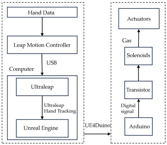 The Leap Motion controller is connected to the computer via USB and accesses hand data through Ultraleap Hand Tracking. To process the acquired hand data effectively, Ultraleap Hand Tracking needs to be installed in Unreal Engine. This setup enables communication between the Leap Motion controller and computing. In Unreal Engine, a gesture recognition blueprint is created to identify specific gestures and store their semantic representations. Communication between Unreal Engine and Arduino is established using UE4Duino, with both systems configured to use the same serial port name and baud rate for easy string-based information transfer. In Arduino, various gesture semantics are associated with corresponding program loops, effectively coordinating gestures with robotic movements. The overall system schematic diagram is shown in Figure 2.