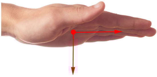 For dynamic gestures, key hand features include palm coordinates, palm velocity, orientation, and the normal direction of the palm. As shown in Figure 3, the palm coordinates are denoted by a red dot at the center of the palm, palm velocity by the speed at which the palm center moves, orientation by the vector from the palm center towards the fingers, and the palm’s normal direction is perpendicular to the orientation of the palm facing inward. Additionally, dynamic gesture characteristics incorporate the center and radius of a sphere, primarily assessing the hand’s degree of curvature, with both the sphere’s center and radius altering as the palm bends.