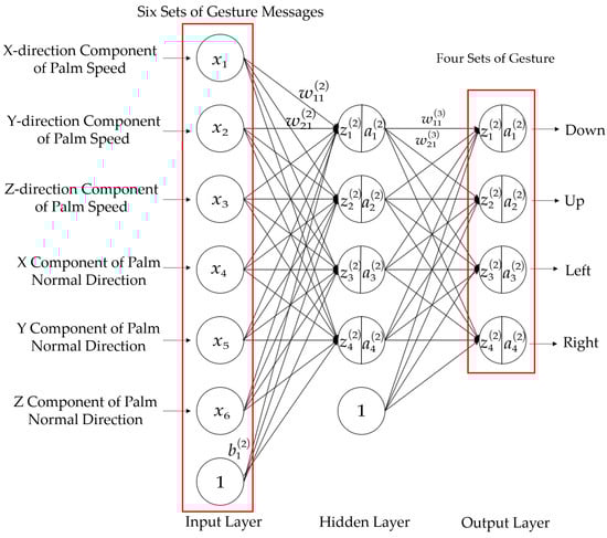The first 2000 sets of data were used as the test set to construct a BP neural network (as shown in Figure 4) with 6 sets of dynamic gesture data as the input layer and 4 dynamic gesture types as the output layer. Dynamic gesture recognition process can be illustrated in Figure 5 denotes the weight of the connection from the neuron in of the network pointing to the neuron in . For example, denotes the weight of the connection from the 1st neuron in layer 0 pointing to the 2nd neuron in layer 1. Similarly, we use to denote the deviation of the neuron in layer , use to denote the linear result of the neuron in layer , and use to denote the output of the activation function of the neuron in layer . Since dynamic gesture recognition is a multi-classification problem, the sigmoid function is used as the activation function of the output layer and the Tanh function is used as the hidden layer activation function.