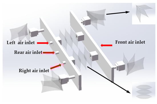 The support plate is made from 4600 resin and is produced using 3D printing technology. As shown in Figure 7, the interior of the support plate is designed as a cavity to reduce the overall weight of the robotic system and to accommodate the air pathway. At the front end, there is a central air inlet connected to this air pathway, allowing gas to enter the internal cavity. The gas then flows into the quadruped through the air outlets located on both the left and right sides. This process causes the thin film actuator, which forms the quadruped, to bend and create friction with the ground. Additionally, the rear support plate features air inlets on both sides to inflate the left and right expandable actuators.