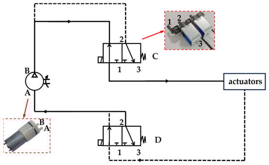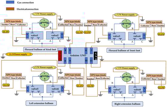 Firstly, the matching relationship between the Arduino digital ports and solenoid valves is defined, as shown in Table 2. Similarly, we establish the relationships between the pumps, valves, and TPU actuators, as shown in Table 3. After defining the corresponding relationship between the pneumatic components and circuit components, the mechanical and electrical integrated control diagram shown in Figure 9 can be created. In the picture, the orange line represents the circuit connections, and the blue line represents the air connections.