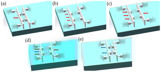 Due to the sufficient friction between the curved actuator of the rear foot and the ground, the next step is to set the digital ports 8 and 10 of the Arduino to a high level. This action electrifies solenoid valves 5 and 7, allowing high-pressure gas to be pumped into the left and right expandable actuators through pumps 3 and 4, respectively. Consequently, the robot’s overall length increases, as shown in Figure 10b. To enable the robot to move forward as a whole, the front end must maintain friction with the ground. When digital port 6 of the Arduino is set to a high level, the solenoid valve 3 is activated, and high-pressure gas is pumped into the front foot through pump 2. This causes the front foot to bend, generating friction with the ground, as shown in Figure 10c. After these initial steps, both the front foot and rear foot of the robot create friction with the ground. To facilitate forward movement, it is necessary for the actuator of the rear foot to contract, eliminating friction between the actuator and the ground. At this time, it is necessary to set Arduino digital port 4 to a low level and 5 to a high level so that solenoid valve 2 is activated, and the gas in the rear foot is sucked into the pump through pump 1. As shown in Figure 10d, the blue arrow represents negative pressure. Because the forefoot of the robot has friction with the ground, extracting the negative pressure from the two expandable actuators enables the overall forward movement of the robot. At this time, digital ports 8 and 10 of Arduino are set to a low level, digital ports 9 and 11 are set to a high level, solenoid valves 6 and 8 are activated, and the gas in the two expandable actuators is extracted by pumps 3 and 4, resulting in the compression of the two expandable actuators, as shown in Figure 10e.