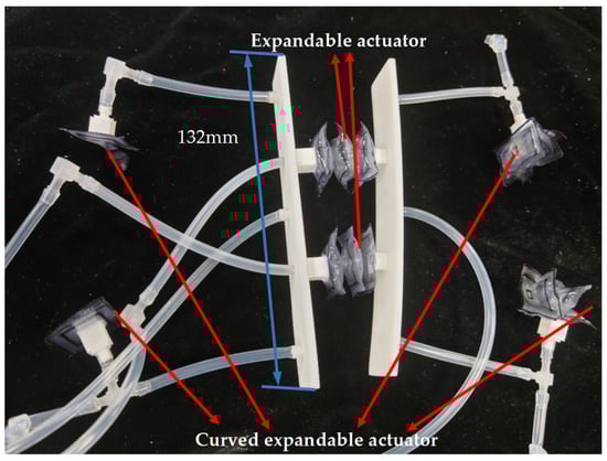 - The digital ports 8 and 10 of the Arduino are set to a high level, and the solenoid valves 5 and 7 are activated. The left and right expandable actuators are inflated and the robot’s front support plate is forward, as shown in Figure 12b.