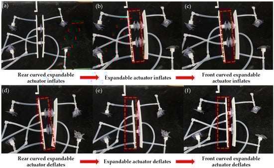 - The digital port 6 of the Arduino is set to a low level, 7 to a high level, the solenoid valve 4 is activated, and the two front curved expandable actuators are deflated under negative pressure and detached from the ground, as shown in Figure 13f.