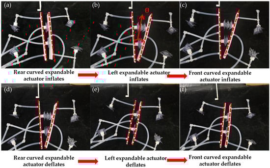 - Arduino’s digital port 8 is set to a low level, digital port 9 is set to a high level, the solenoid valve is activated, the left expandable actuator is deflated to negative pressure, and the robot completes steering, as shown in Figure 13e;