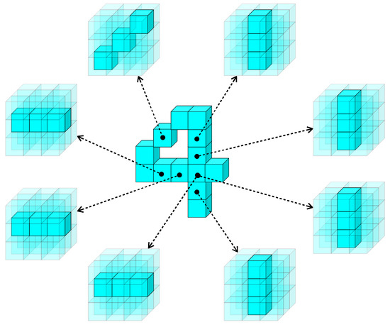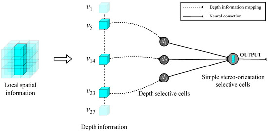 The depth selective cells do not directly accept the spatial information and are commonly reported as existing in high-order cortical layers [44,81,82,83]. There are multiple middle stages before depth selective cells respond to preferred depth information. However, the presence of depth information will truly activate specific depth selective cells, establishing a definitive causal relationship [3,82,83]. Therefore, the recognition process of spatial depth information can be directly simplified by mapping the voxel value of spatial elements at specific positions within a local space as direct inputs to depth selective cells. Within a local voxel space sized as , 27 spatial elements can be identified and denoted from to . Accordingly, the activation d of a depth selective cell can be quantitatively defined as follows: