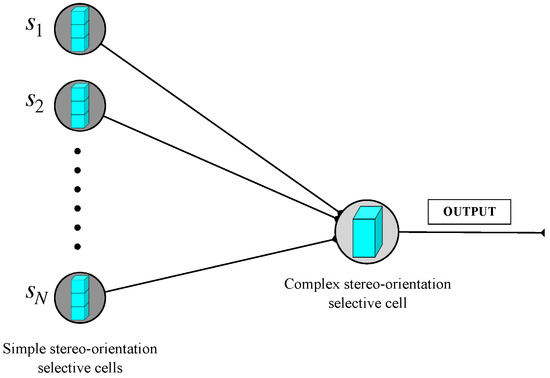 The simple stereo-orientation selective cells receive inputs from three specific depth selective cells, which provide corresponding depth information that can be combined to form a local stereo-orientation feature. As illustrated in Figure 3, the three depth selective cells extract distinct depth information, which collectively contributes to a vertical orientation feature. Subsequently, the simple stereo-orientation selective cell integrates these inputs and exhibits selectivity towards vertical orientation. We employed the Sigmoid function to model simple cell activation, a widely employed technique in the field of neural modeling [84,85,86]. The activation value s of a simple stereo-orientation selective cell is defined by the following formula: