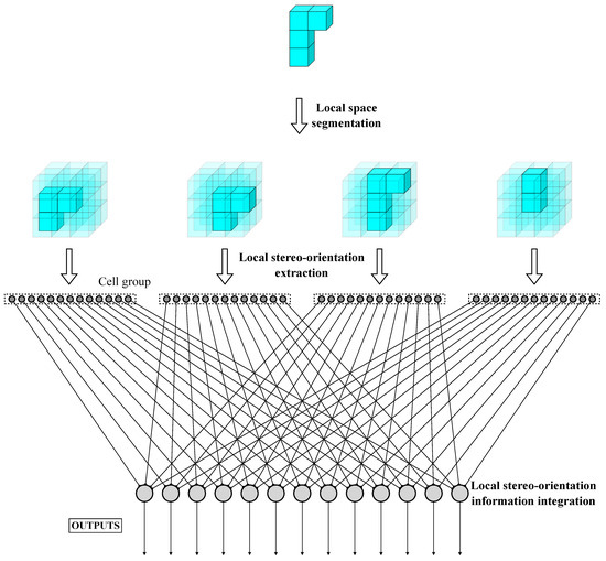 Local orientation selectivity is generated by simple stereo-orientation selective cells through the integration of specific depth information within a defined local space, which is extracted by depth selective cells. To quantify the computation of stereo-orientation selectivity, a fixed-scale local space with dimensions of is designed, allowing for the definition of 13 specific stereo-orientations within each local space. Figure 3 illustrates an instance of the information processing flow for local stereo-orientation information.