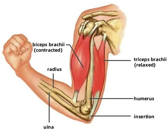 Moreover, the bones and muscles do not function independently but operate collaboratively. Bones offer stable anchor points, while muscles apply tensile forces to drive movement. This collaboration ensures efficient and stable motion. Furthermore, the bone–muscle system enables joints to possess multi-DOFs motion capabilities. For example, the shoulder and wrist joints can move flexibly in various directions due to the support provided by bones and the coordination of multiple muscle groups. This seamless collaboration between bones and muscles supports the body’s ability to perform highly dynamic and adaptable movements, integrating stability, precision, and flexibility into a unified system.