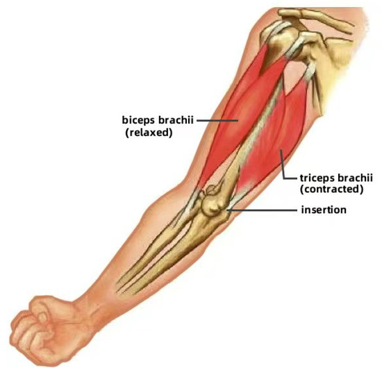 In biological systems, bones provide structural support and stability for the entire body, enabling muscles to exert their maximum efficiency during contraction. For instance, in the arm, the humerus, radius, and ulna form a solid framework that allows muscles to attach to the bones and facilitate flexible movement. In addition, muscles drive the motion of bones through contraction and relaxation, with different muscle groups coordinating to achieve complex movements. For example, the biceps and triceps work antagonistically to control the bending and extending of the elbow by contracting and relaxing in opposition. Figure 1 illustrates the forearm flexion; the biceps brachii contracts to pull the forearm upward, while the triceps brachii remains relaxed. Conversely, Figure 2 displays forearm extension. The triceps brachii contracts to straighten the forearm, while the biceps brachii relaxes.