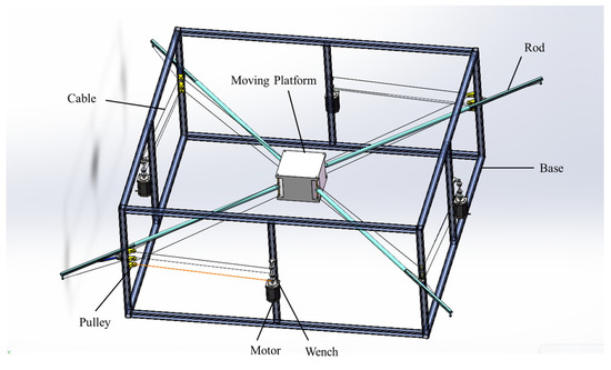 The design of the novel CDPR incorporates rigid rods to simulate the supporting function of bones, providing a foundational structural framework for the system. These rods not only offer stability but also connect various driving points, enabling the efficient transmission of cable tension to the platform for precise positioning and stable movement. Meanwhile, the cables act as “muscles” in the system, controlling platform motion by adjusting their length. The coordinated control of cables in multiple directions allows the platform to achieve precise motion within multiple DOFs. The regulation of cable tension mimics the contraction force of muscles, enabling control over the direction and magnitude of movement. The combination of rods and cables emulates the synergistic mechanism of bones and muscles, with rigid rods providing bone-like support and cables driving the motion of the rods and platform through tensile forces. This integration ensures efficient tension transmission, resulting in more stable and precise driving performance.