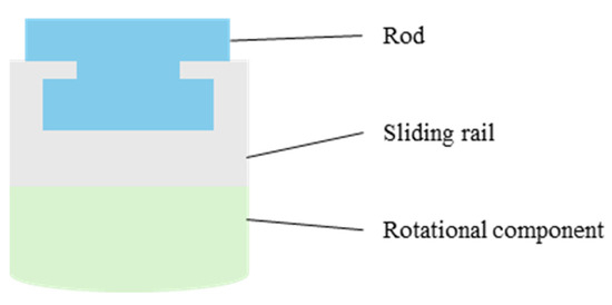 Figure 3 illustrates the CAD model of the proposed novel CDPR structure. Each vertical edge of the moving platform is connected by two cables and a rod, with the other end of the rod connected by an additional cable. This configuration effectively makes each vertical edge of the moving platform driven by three cables and one rod. The three cables are collectively attached to the motor’s rotating shaft, with the two cables directly connected to the moving platform sharing the same winding direction, while the cable connected to the rod is wound in the opposite direction. This design allows the rod to be pulled in coordination with the two cables connected to the moving platform. All three cables pass through three pulleys fixed on the base to change direction, with the cable connected to the rod oriented oppositely to the other two cables and attached to the rod’s end. In this structure, the three cables remain parallel and, after passing through the pulleys, they stay aligned with the rod. One end of the rod connects to the moving platform, while the other end connects to a cable. The base also provides a rotatable sliding rail mechanism, allowing the rod to rotate about the z-axis and move freely in the x–y plane. This setup forms a novel planar cable-driven parallel robot that combines cables and rods, achieving three degrees of freedom: translational motion in the x–y plane and rotational motion about the z-axis. Figure 4 provides the cross-section of the rotatable sliding rail mechanism; the entire mechanism is designed in a form resembling a cylinder. The green component represents a rotatable structure designed to provide rotational motion in the x–y plane. The gray component is a sliding rail mechanism mounted on top of the rotatable structure. It is securely attached to the green structure and rotates together with it, maintaining alignment throughout the rotational motion. The blue component is a rod that can freely slide along the gray sliding rail, allowing translational movement within the constraints of the rail.