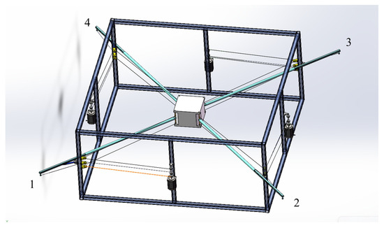 In this system, the design of the rod connections is crucial for motion control and stability. Figure 8 displays the middle cable’s connection in the proposed novel planar CDPR. Each rod is fixed at both the rotatable sliding rail on the base and the moving platform, driven by the middle cable, and it remains parallel to the upper and lower cables directly connected to the moving platform. This arrangement not only provides structural support but also ensures smooth and stable planar movement of the platform. Because each rod remains parallel to the platform-connected cables, this configuration simplifies the calculation of the middle cable length, allowing for efficient control of the moving platform position. Furthermore, this parallel alignment enhances the overall rigidity and precision of the system, reducing undesired motion fluctuations and improving positional accuracy. Assuming each rod has a fixed length of , we can express the length of the middle cable as follows: