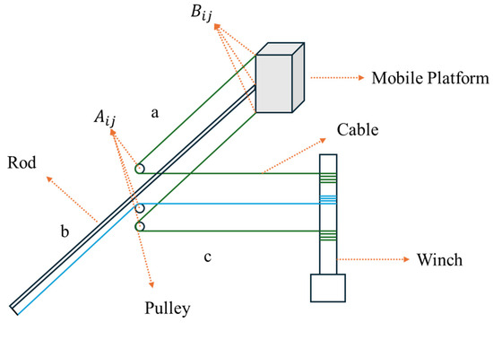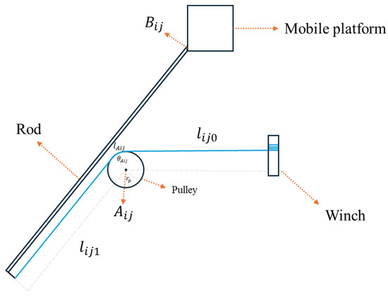 where refers to the length of the cable from the pulley to the point where it connects with the end of the rod. The value of should be the same as that of , since the three cables in each group remain parallel, and the position of the pulley is fixed. Therefore, can be represented as follows: