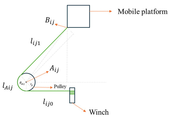 where is the contact length between the pulley and the cable, and is the cable length between the winch and the pulley, which is a constant value. In addition, is the distance from the pulley to the connection point between the moving platform and the cable. Since the coordinates of the pulley center , the pulley radius , and the coordinates of the connection point between the moving platform and the cable are known, we can directly obtain the length of :