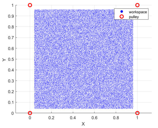Figure 10 illustrates the translation workspace plotted in a 2D plane. Assume the proposed planar CDPR is fixed within a square frame with a side length of 1 m, each rod has a length of 1.5 m, and the cables lengths are sufficiently long. Blue dots represent the feasible positions of the platform that satisfy the cable length constraints. Red points indicate the pulleys’ positions. The workspace exhibits a square-like shape due to the symmetrical configuration of the pulleys and equal cable lengths. The dense distribution of blue dots within the workspace indicates that the platform can access nearly all positions within this region, demonstrating effective operational coverage. Under ideal conditions, the proposed planar CDPR achieves a workspace coverage of 84.64% of the theoretical maximum area. Therefore, the uniform coverage and accessibility of the workspace make this planar CDPR suitable for applications such as robotic assembly tasks, pick-and-place operations, and 3D printing. Although the workspace appears dense and accessible, practical limitations such as external disturbances may influence the actual performance. Experimental validation of the workspace will be conducted once the prototype is fully constructed to confirm the accuracy of these theoretical predictions.