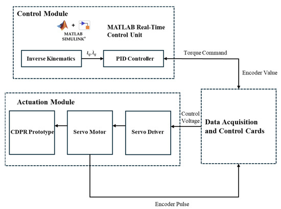 The control system diagram of the proposed planar CDPR is shown in Figure 11. In the workspace of the proposed planar CDPR, the proportional–integral–derivative (PID) control method is employed to achieve high-precision positioning and trajectory tracking of the end-effector. The system architecture consists of three main components: the control module, the data acquisition and control card module, and the actuation module, forming a closed-loop real-time control system. The control module operates in the MATLAB Simulink real-time environment, where inverse kinematics is used to compute the target cable lengths, and a PID controller generates real-time torque commands to ensure precise positioning and trajectory tracking of the end-effector. Furthermore, the data acquisition and control card module connect the control module and the actuation module by transmitting control signals and collecting encoder feedback from the servo motors for real-time error correction and closed-loop control. In addition, the actuation module comprises servo drivers, servo motors, and the CDPR prototype, which adjusts cable lengths to achieve the physical motion of the end-effector.