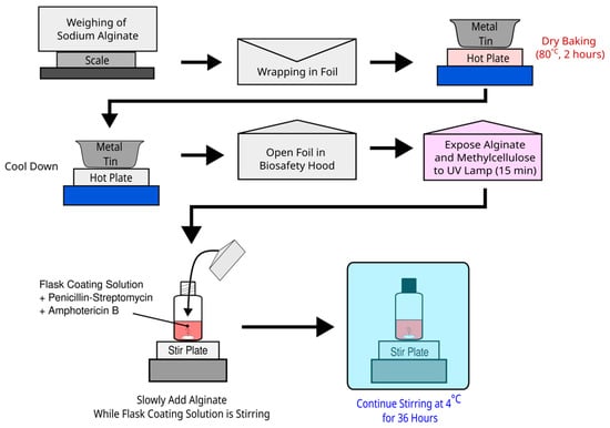 Figure 1 details how both solutions were prepared. To maintain sterility, alginate powder was weighed, wrapped in aluminum foil, and then placed in a metal tin, with additional folded aluminum foil at the bottom of the tin to keep the alginate from directly contacting the bottom. This tin was then placed on a hot plate set to approximately 80 Celsius for 2 h. After being allowed to cool to room temperature, the tin was brought to a biosafety hood, and the alginate powder was carefully unwrapped on the working surface. The tin was removed, and the powder was exposed to the UV lamp of the biosafety hood for no more than 15 min []. After this, the prealiquoted flask coating solutions were placed in the biosafety hood. The stir plate was turned on and set to a mild cycle based on the qualitative gauge of the stir plate, and alginate was slowly added to the solution for about 5 min. Once addition was complete, the alginate–ECM solution was secured and was stirred at a similar cycle in a 4 °C cold room for 36 h. For all experiments, a 4% (w/v) alginate–ECM solution was prepared by adding 1 g of sodium alginate to 25 mL of ECM-containing MEM solution. To produce alginate–methylcellulose–ECM solution, methylcellulose was added to the flask coating solution shortly after the addition of sodium alginate. Methylcellulose was added more carefully for about 10 min as it greatly increased the viscosity of the solution, requiring a more aggressive stirring over 36 h. The final concentration of methylcellulose was 4% (w/v), a 1:1 ratio with dissolved sodium alginate.