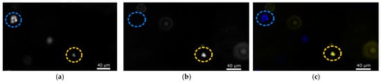Use of NucBlue Live and NucGreen Dead to determine cell viability in hydrogels. In all subfigures, living cells are circled in blue, whereas dead cells are circled in yellow. (a) Staining of all nuclei using NucBlue Live. (b) Staining of the nuclei of dead and dying cells using NucGreen Dead. (c) A merged image of both the DAPI (NucBlue) and FITC (NucGreen) channels.