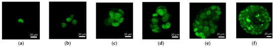 Clusters categorized per Section 2.6 had their volume approximated assuming the shape of a prolate spheroid (Equation (2)) []. The equatorial diameter is determined by assuming that the maximum intensity projection of the aggregate is a circle, and finding the radius from the area measured in FIJI (Equation (3)). The polar diameter is determined by multiplying the number of optical sections taken for the Z stack by the Nyquist Rate. To determine the spatial confinement, or the amount of cluster volume that each cell approximately has, the total volume, , of the cluster determined using Equations (2) and (3) is divided by the number of cells in the cluster.