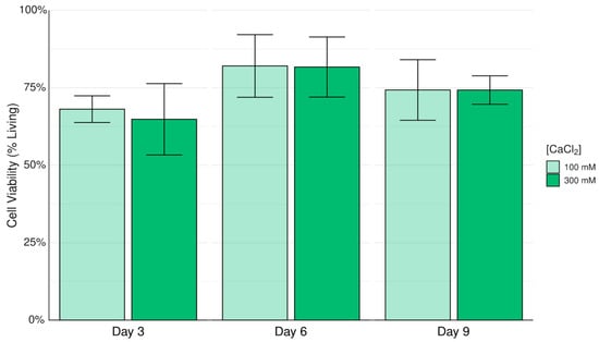 As shown in Figure 5, on both Day 3 (p = 0.0015) and Day 6 (p = 0.014), there was a significant decrease in 16HBE14o- cell viability when embedded in alginate–methylcellulose–ECM hydrogels and crosslinked with 300 mM calcium chloride solution. On Day 9 there was no significant difference in cell viability between hydrogels crosslinked with the two crosslinking solutions, potentially due to dividing cells allowing the hydrogel to recuperate from large amounts of cell death. This difference is striking compared to observations in alginate–ECM hydrogels (Figure 4).