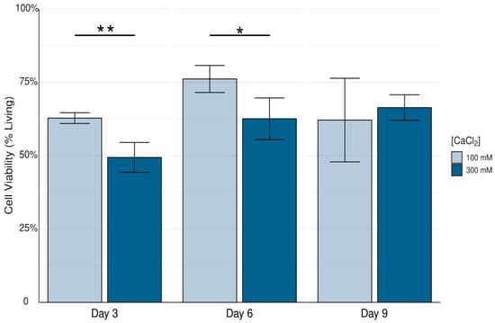 The normality of the observed cell viabilities was tested using the Shapiro–Wilks Test (lowest p = 0.0995). Student’s Two Tail t-Test was used to compare the mean percent viability determined on Days 3, 6, and 9 of hydrogels cross-linked using either 100 mM or 300 mM calcium chloride solution. p values below 0.05 were considered significant. Data are represented as arithmetic means and standard deviations. Significance is reported as * (p < 0.05), and ** (p < 0.01).