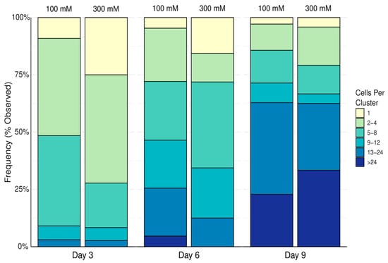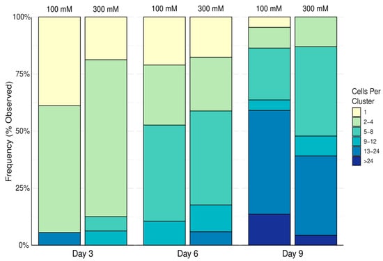 Figure 6 demonstrates that over time, cell clusters bearing larger numbers of cells become more prevalent. It was found that there was no association between calcium chloride concentration and any differences in the frequency of a particular cluster’s cell count. These observations suggest that in an alginate–ECM hydrogel, calcium chloride concentration does not have any long-term effect on the ability for living cells to either continue dividing or aggregate together over time.