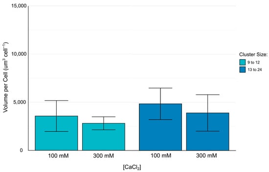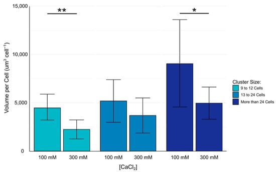 Cell clusters of 9–12 (p = 0.002) and more than 24 cells (p = 0.02) within hydrogels crosslinked with 100 mM calcium chloride solution exhibited a higher volume per cell than hydrogels crosslinked in 300 mM calcium chloride solution (Figure 8). This suggests that higher concentrations of calcium chloride produce a hydrogel that confines cells into a tighter space. Conversely, cell clusters with 13–24 cells exhibited no significant difference in spatial confinement, an observation that will require additional experimentation to fully elucidate.
