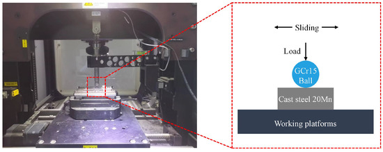 The sliding wear test was carried out in the Multifunctional Friction and Wear Testing Machine (MFT-5000, RTEC, San Jose, CA, USA) with the aim of investigating the impacts of biomimetic texture and Ti coating on the sliding wear behavior of the substrate. Figure 3 presents a schematic diagram of the sliding wear test. Given that the substrate material in this experiment was intended for use in the front-end ear picker roller of the corn harvester, which is a component that directly interacts with corn ears and demands a high level of wear resistance, a relatively harder GCr15 steel ball with a hardness of 55 ± 3 HRC was selected as the friction counterpart. In the actual operational context of the corn harvester ear roller, lubrication is absent. Therefore, dry friction was opted for as the experimental condition. All tests were performed without the use of lubricants at room temperature (25 °C) and 30% humidity. The experimental parameters are enumerated in Table 2. To minimize experimental errors, each test was replicated three times during the sliding wear tests.