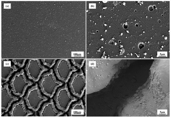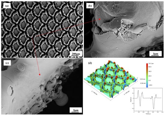 Figure 4a–c display the SEM images of the modified surfaces. The image presented in Figure 4a represents the surface morphology of the biomimetic texture as observed at a magnification of 50 times. It can be observed from the image that the laser processing led to a distinct outline and a surface with a structurally regular pangolin scale-like appearance.