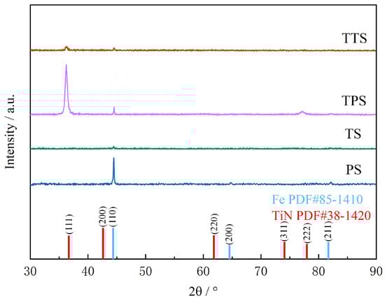 The hardness values of the TS and the TTS were significantly higher than those of the PS and TPS. This is due to the high hardness of TiN coatings, which, when applied to the material surface, can significantly enhance overall hardness performance [46,47]. TiN typically exhibits good strength and hardness characteristics. During the coating process, there may be some interaction between TiN and the base material, such as the formation of chemical bonding or the generation of diffusion layers, therefore enhancing the surface hardness of the material. For example, research by Ke Chen et al. [48] involved processing TiN coatings on stainless steel. The study indicated that high-energy processing chambers promoted the rapid formation of chemical bonds in the TiN layer, revealing the corrosion-resistant mechanism of TiN at the atomic scale. This demonstrates a strong chemical bonding between TiN and the substrate, forming a dense protective layer.