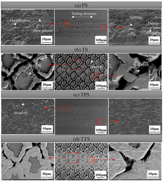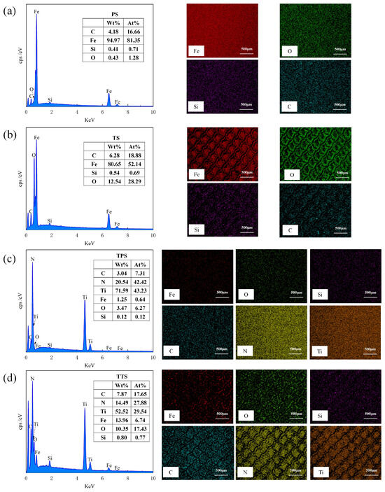 Figure 7 showcases the EDS results of the material surfaces. From Figure 7a, it is clearly observable that, in addition to Fe, Si, and C, O elements are detected on the surface of the test specimen. The origin of O is mainly ascribed to oxidation reactions when the material is exposed to air. As depicted in Figure 7b, following laser processing, there was a growth in the O content on the material surface, with the weight percentage (Wt) ascending from 0.43% to 12.54%, and O is distributed at the edges of the texture. By integrating Figure 7c,d, it can be noticed that not only is the O content substantial on the TS surface but it is also enhanced on the TTS surface, signifying that oxidation took place during the femtosecond laser processing. During the processing, the laser did not inflict obvious thermal damage to the interior of the material; thus, the oxidation traces were mainly dispersed within the texture. The existence of oxides frequently results in an augmentation of material hardness, and the material’s wear resistance is also marginally improved. Cheng et al. [34] suggested that oxides may have beneficial or detrimental effects on the tribological behavior of materials. If the bond strength between oxides and the steel substrate is low, severe wear may occur due to fracturing or detachment from the steel substrate. In essence, under the action of frictional forces, adhesion points are sheared and slid, leading to oxide debris acting as free third bodies, causing wear on opposing surfaces. Ultimately, the wear process becomes a cycle of alternating adhesion and abrasion debris formation.