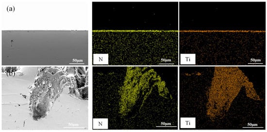 Apart from surface texturing, surface coating is also a common method for improving material wear resistance. Methods for processing surface coatings include spraying, chemical vapor deposition [14], physical vapor deposition [15], and electrochemical deposition. The materials used for coatings are typically aluminum oxide (Al2O3), tungsten carbide (WC) [16], titanium nitride (TiN) [17], among others. TiN coatings have relatively high hardness and good wear resistance and chemical stability, so many researchers are enthusiastic about using various methods to process TiN coatings onto matrix materials to improve the specific properties of TiN coatings [18,19,20].