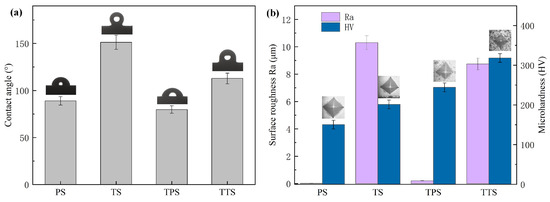 As shown in Figure 9b, the roughness of the PS surface Ra = 0.02 μm, the TS surface Ra = 10.30 μm, and the roughness of the TPS surface Ra = 0.21 μm also increased, and the TTS surface Ra = 8.74 μm. The increase in roughness is mainly due to the presence of microstructure and the introduction of rough coating. The TS-treated surface exhibits the highest roughness value, which is caused by the significant height difference between the bottom of the surface and the raised part. These findings indicate that the modification process not only changes the microstructure of the metal surface but also has an important impact on its surface roughness.