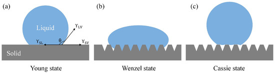 Wetting behavior of droplets on various solid surfaces. (a) Young’s model, (b) Wenzel model, (c) Cassie.