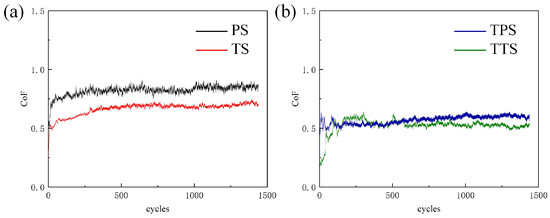 Finally, as analyzed earlier, the TS surface had a higher hardness than the PS surface, which was also a significant factor contributing to the reduction in the friction coefficient. Therefore, surface deformation pretreatment can effectively enhance the anti-friction performance of the substrate surface. Figure 9b depicts the variation in friction coefficients of samples after deposition of TiN. Similarly, all samples exhibited a running-in phase, with the TPS surface having a running-in cycle count of 82 cycles, followed by a stable friction coefficient phase. In the stable friction stage, the average friction coefficient of the TPS sample 0.58 decreased by 30.9% compared to the PS surface. This was mainly due to the increased surface hardness after being processed with a TiN coating, making it less prone to being scratched by steel balls on the metal surface, reducing the contact area and, therefore, lowering the friction coefficient. The TTS surface had a running-in cycle count of 177 cycles. In the stable stage, the average friction coefficient of the TTS sample 0.52 in the stable sliding phase decreased by 38.1% compared to the PS sample. This result was a collaborative outcome of the TiN coating and pangolin biomimetic texture, indicating that surface texture pretreatment played a positive role in enhancing the tribological performance of TiN coatings.