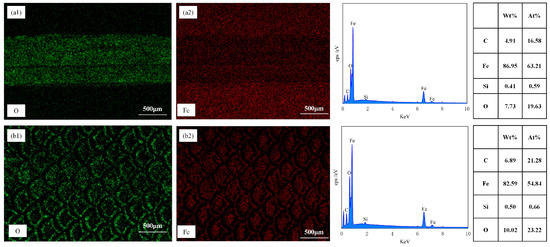 In Figure 13(b1), EDS elemental analysis showed that the O elements generated during laser texturing decreased after a period of wear. The O elements on the unaltered matrix surface showed minimal variation, proving that the wear primarily occurred at the textured protrusions during the wear process. The distribution of Fe elements in Figure 13(b1) confirmed the reduction in adhesive material.