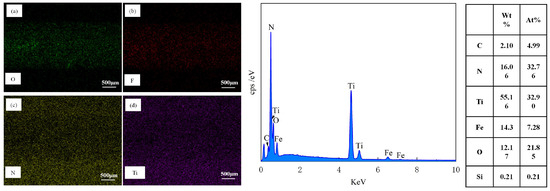 EDS Elemental Composition Analysis of TPS Material Surface after 1500 Sliding Cycles, (a) O, (b) F, (c) N, (d) Ti.