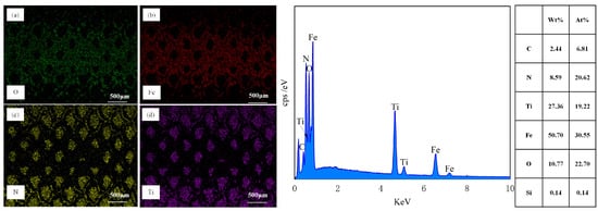 Figure 12c exhibited the SEM wear morphology of the TPS sample subsequent to 1500 sliding cycles after the application of a TiN coating. It was clearly discernible from the image that the sample surface remained intact, devoid of any indications of plowing, spalling, or the presence of wear debris within the wear tracks. However, a substantial amount of adherent material was observable on the surface. It is widely acknowledged that a prominent characteristic of GCr15 bearing steel is its intrinsic viscosity during sliding friction, which is manifested as a propensity for material transfer. The high-hardness TiN coating further expedited the wear of the steel ball with which it interacted. The EDS image of the abraded surface, as presented in Figure 14, disclosed the distribution of Fe elements, as depicted in Figure 14b. This further corroborated the adhesion of the wear ball within the wear track, providing compelling evidence for the analysis of the wear mechanism.