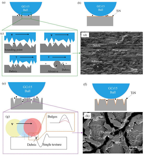 Cross-sectional schematic diagrams of the wear mechanism models of the samples under dry friction conditions: (a–c,e–g). SEM morphology images of the material surface after 1500 sliding cycles: (d) PS, (h) TS.