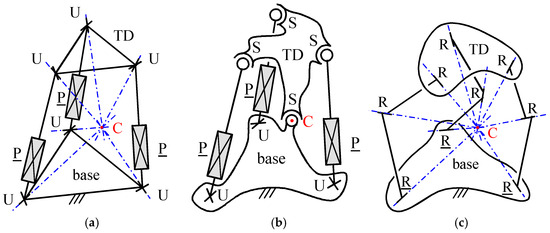 Example of SPMs (U, P, and S stand for universal joint, prismatic pair and spherical pair, respectively; the underscore indicates the actuated joint; point C is the spherical motion center): (a) 3UPU wrist [42], (b) S-3UPS wrist [43] (also named fully-parallel wrist), and (c) 3RRR wrist [44,45].