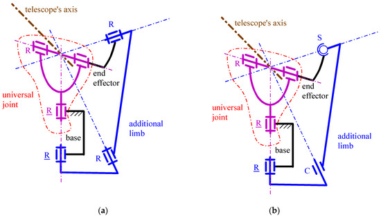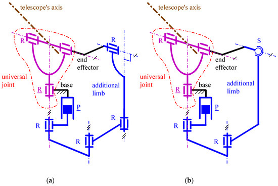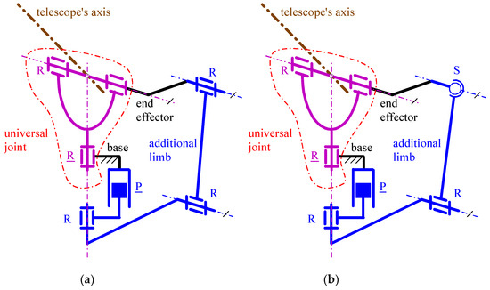 In [47], firstly, a comparative analysis of the PPSs presented in the literature brought the authors to select the six architectures (three overconstrained plus three equivalent (i.e., with the same kinematics) non-overconstrained) shown in Figure 3, Figure 4 and Figure 5 for orientating the axis of a telescope. Then, the conditions in which the end effector, which is fixed to the telescope, can perform a full rotation (i.e., RoM of 360°) around a vertical axis and a partial rotation with a RoM of 120° around an horizontal axis made the authors able to address their dimensional synthesis. All these architectures connect the end effector to the base through one U joint and an additional limb that act in parallel, thus forming a single loop.