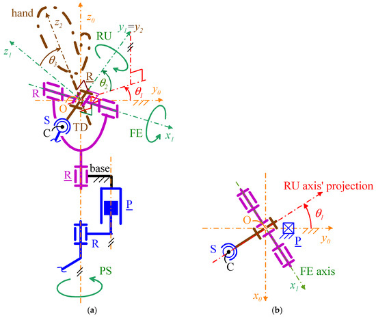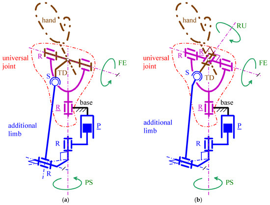 Single-DOF WPs are essentially revolute (R) pairs (see [4,9,10,11,12,13,14,15], for instance). They are named “flexors” (“rotators”) when the R-pair axis is perpendicular (parallel) to the forearm axis: that is, when they generate FE (PS) motion of the artificial hand. In some cases, they can be serially connected to generate two- and three-DOF WPs [16,17,18,19]; in particular, the serial combination rotator–flexor–rotator with a roll–pitch–yaw axis arrangement reproduces PS-FE-RU motions. Nevertheless, such dispositions are usually not able to match the weight and size requirements of WPs.