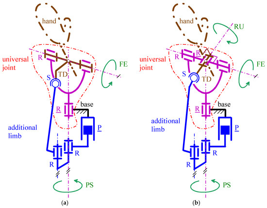 WP architectures based on the PPS architecture of Figure 5b: (a) 2-DOF arrangement of R⊥R-P||R||RS type, and (b) 3-DOF architecture of R⊥R⊥R-P||R||RS type obtained by adding one R pair.