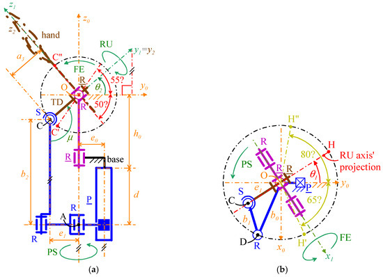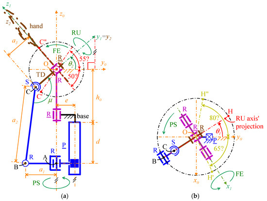 With reference to Figure 6 and Figure 7, in all the four architectures, the decoupling between PS and FE motions comes from the coincidence of the axis (PS rotation axis) of the actuated R pair adjacent to the base and the axis of the passive R pair adjacent to the P pair. Consequently, the FE analysis is conducible on a planar scheme obtained by projecting the mechanism onto the meridian plane passing through the PS axis and perpendicular to the FE axis (Figure 9a and Figure 10a). Moreover, the PS analysis is conducible on a planar scheme obtained by projecting the mechanism on a plane perpendicular to the PS axis (Figure 9b and Figure 10b). Eventually, in the novel 3-DOF architectures (Figure 6b and Figure 7b), the PS and FE analyses coincide with those of the 2-DOF architectures, and the RU analysis is conducible by projecting the TD together with the U joint onto the plane passing through the FE axis and perpendicular to the RU rotation axis (Figure 11).