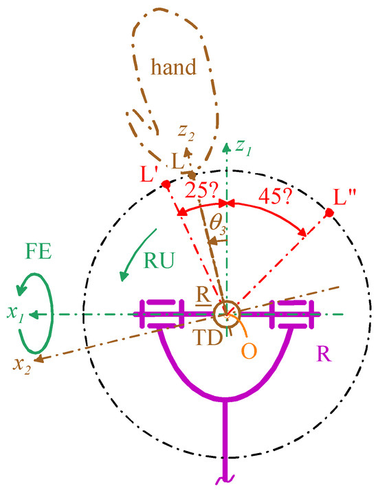 - θ3 is the joint variable of the actuated R pair adjacent to the TD that also measures the RU rotation; with reference to Figure 1, positive (negative) values of θ3 correspond to a radial deviation (an ulnar deviation). In 2-DOF WP, θ3 is constant and equal to 0°.