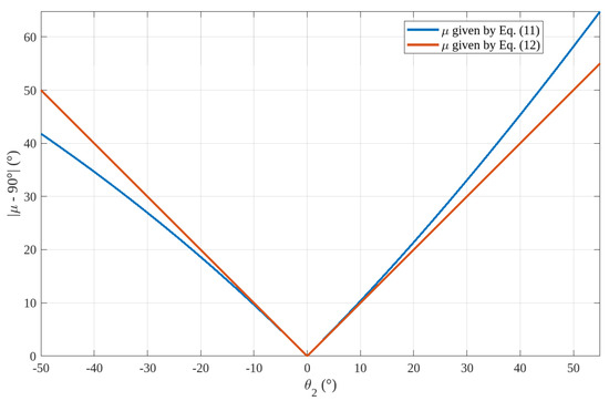 which gives μ = 90° at θ2 = 0 if and only if , which, for the already chosen value of , gives mm. Also, the adoption of this condition together with Equation (7) yields and brings one to choose mm for minimizing the WP length. This choice gives mm for the already chosen value of .